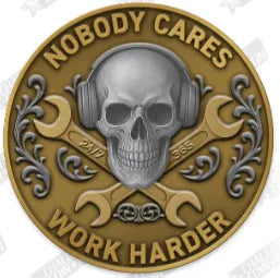 Flip the coin and the reverse delivers the darker humor that only maintenance culture truly appreciates. A skull wearing hearing protection sits at the center, framed by industrial scrollwork and crossed wrenches. The message is clear and unapologetic: