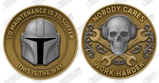 The obverse features a helmeted warrior inspired by the Mandalorian aesthetic, symbolizing the modern aircraft maintainer: disciplined, resilient, and unbreakable. Encircling the design is the blunt truth every maintainer knows by heart: